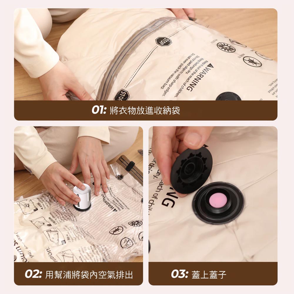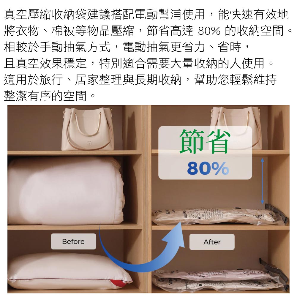 真空壓縮收納袋建議搭配電動幫浦使用,能快速有效地將衣物、棉被等物品壓縮,節省高達 80% 的收納空間。