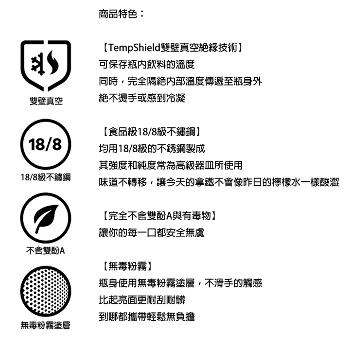 瓶身使用無毒粉霧塗層,不滑手的觸感
