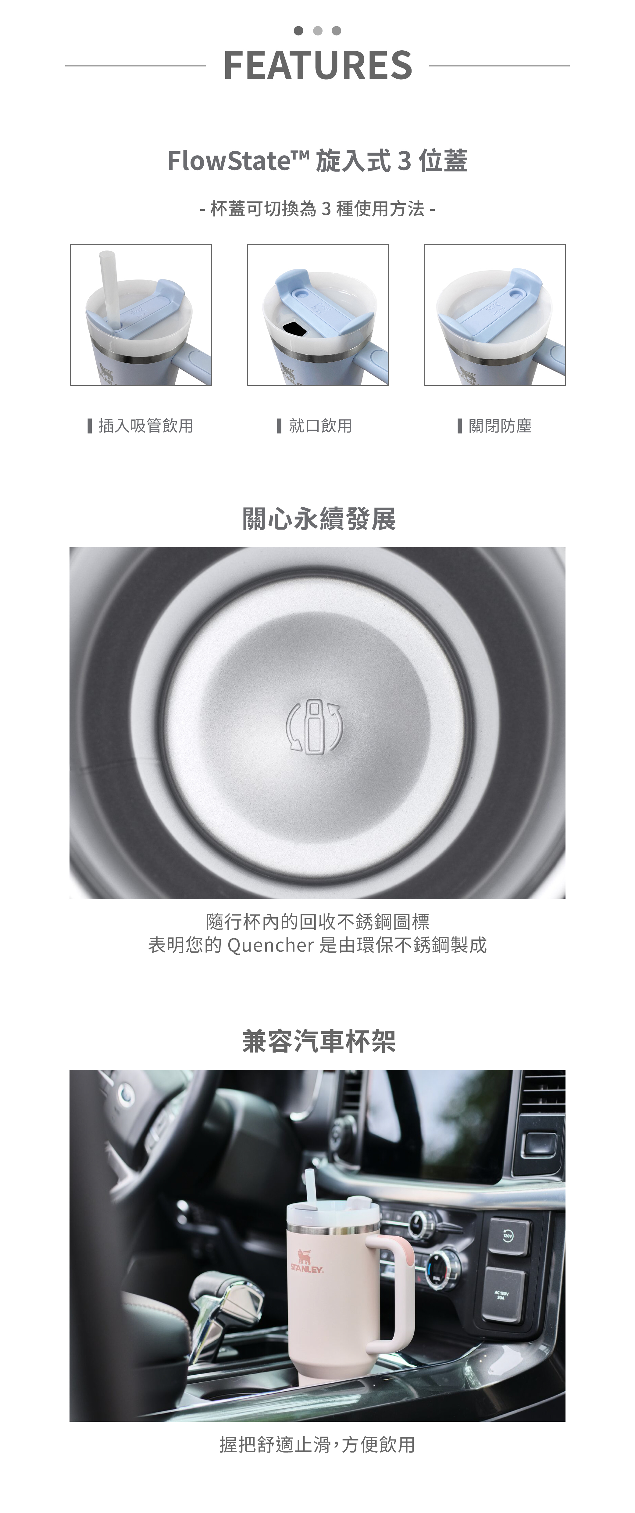 FlowState™ 旋入式 3 位蓋,可防塵或就口飲用